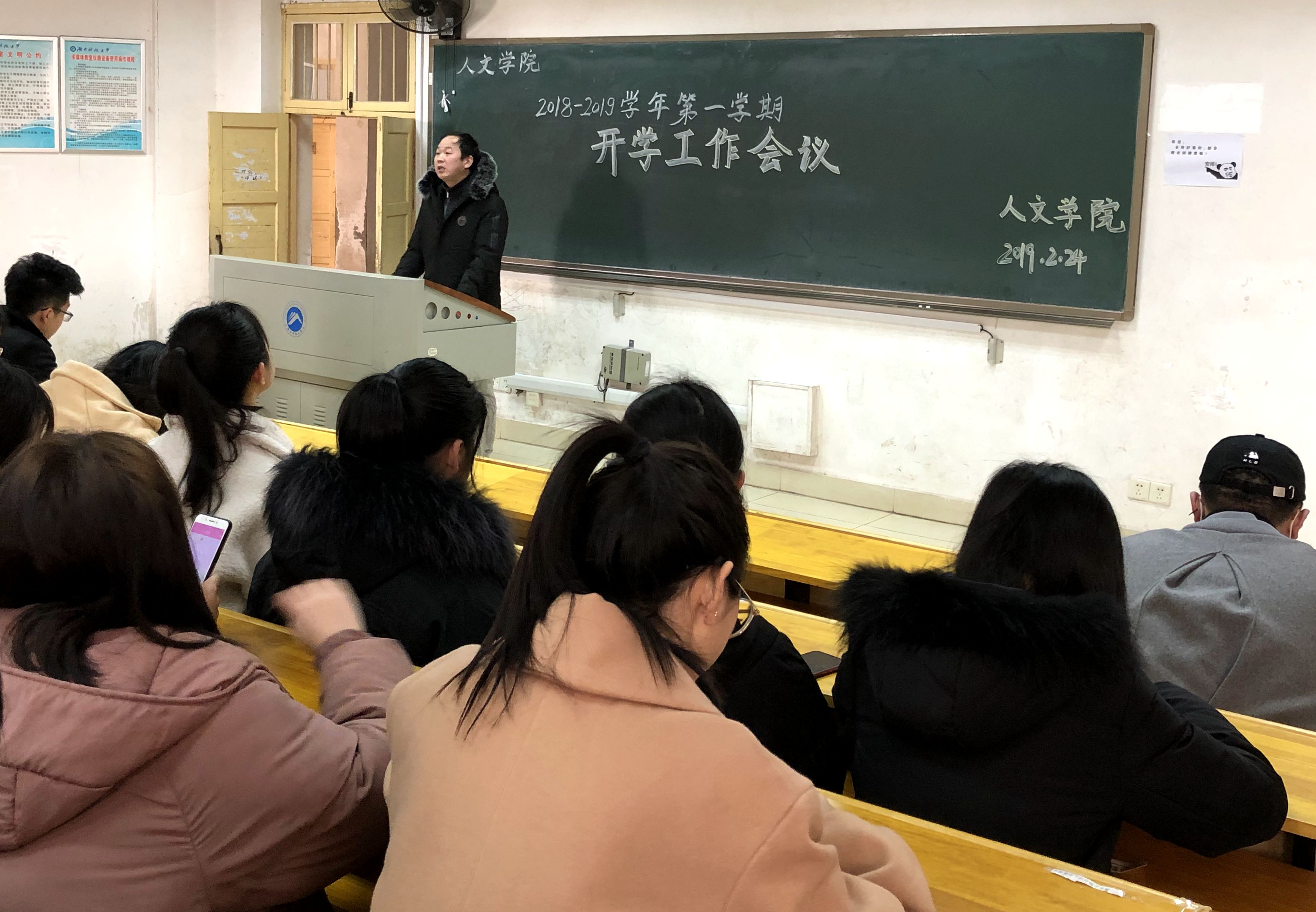 为了迎接新学期的到来,保证新学期学生工作的顺利进行,我院于2月24日上午9点在第十教学楼东附楼104召开2019年新学期第一次全体学生干部大会,本次会议由马忠石老师主持,主席团成员、各部门干部以及各班班长或团支书参加。