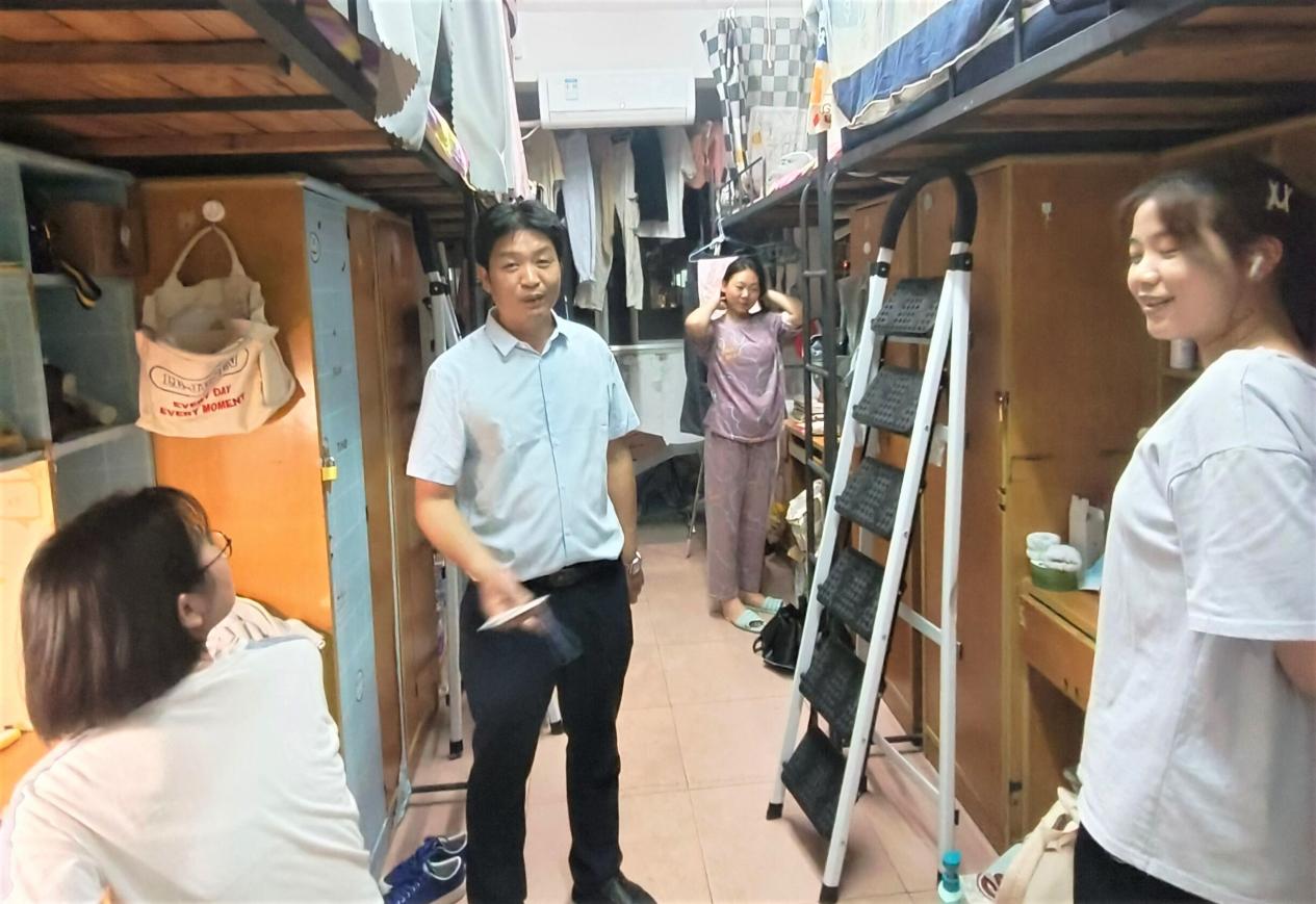 寝室中,罗振军关心学生健康问题,提醒学生做好个人防护,预防感冒,注重宿舍卫生情况,定期通风,经常清洁,尽量避免细菌滋生。为减少宿舍安全隐患,老师们就宿舍空调的使用、寝室用电安全与不使用大功率电器、不私拉电线等方面进行强调要求。此外嘱咐道:“夏季临近,大家要远离野外水源,警惕下河下江,保护自身安全。”正值学风建设月和考试月,老师们鼓励学生认真复习,加强学习管理,积极备考,营造良好的学习氛围。