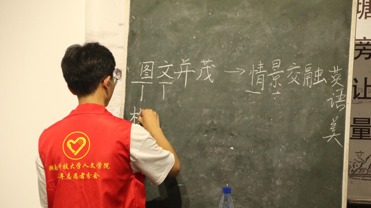 “咱中国字是方块字,尤其讲究横平竖直,一定要把字写正了,就像我们做人也要挺直脊梁一样。”志愿者张佳益拿起一截粉笔转身在黑板上认真地书写上“图文并茂”四个大字,他将书法课与绘画课相融,以绘画的线条和图像辅助书法的书写,到达情景交融的目的。“梅子金黄杏子肥”,他继续在黑板上写下这首诗的其中一句,志愿者彭钰蓉在一旁补充解释道:“大家都知道梅子金黄时节是夏季,那么在这个季节一树树的梅子变的金黄,杏子也越长越大了,同学们可以先理解大意后再进行书写。”俩位志愿者配合默契,一步步引导着同学们。