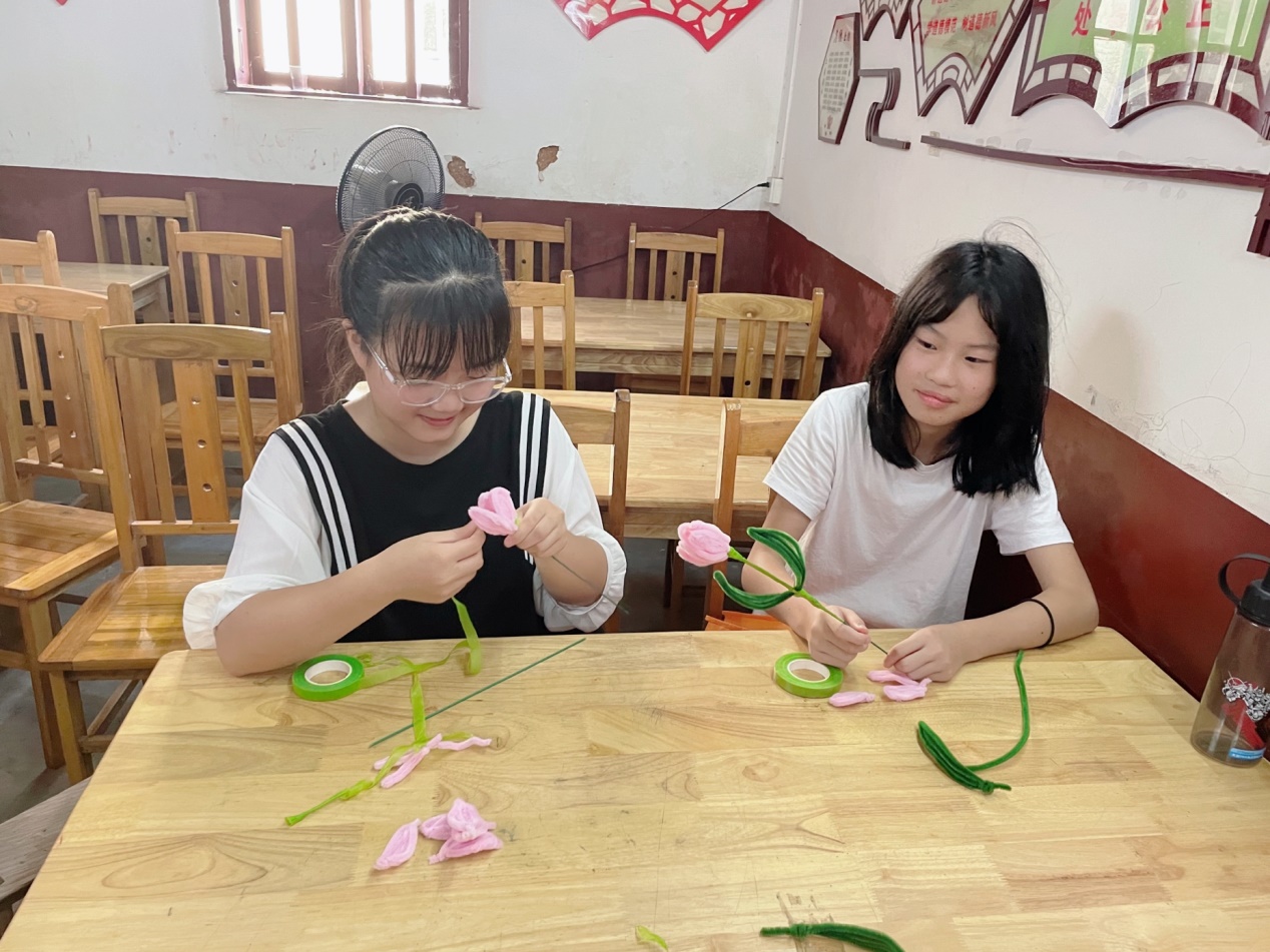 花朵在指尖呈现,快乐在心中绽放。“大家先看老师演示,将手中粉色的棒子折成花瓣的形状......用绿色的棒子做成叶片......”志愿者手把手耐心地教孩子们做手工,将快乐传递给孩子们。手工的意义不仅在于做出美观的作品,更在于考验和培养孩子们做事的耐心和细心。手工课结束后,孩子们将自己制作的郁金香送给志愿者,感谢他们连日来的谆谆教导与认真备课。