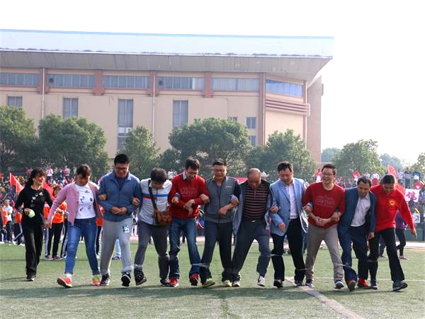 接到规程后,我院老师积极采取行动,充分做好了思想动员和落实工作,迅速组成了约30人的教职工队伍,抓紧训练,在田径场上一展风姿。比赛前,现场的老师们就开始进行如火如荼的准备工作。一声哨响后,比赛开始。首先进行的是教职工“蛟龙出海”比赛,各队队员排成一排,相邻队员腿部由透明胶带绑牢固,比赛开始后,各队队员集体前行。以全体成员躯干到达终点的顺序决定排名。各位教职工你追我赶,以百倍热情参与其中。接下来是教职工“快乐传递”比赛。教职工们互相勾住肩膀站成一排,将呼啦圈从队首第一个人传递至最后一个人,用时最短者获胜。老师们拉紧双手,凭借默契的配合达到最理想的比赛结果。最后进行的是教职工“同心协力”比赛,即跳长绳比赛,比赛八人一组,两人摇绳,六人齐跳。六人同时起跳开始计数,两分钟后结束。开赛前,队员们跃跃欲试,进行热身准备,并按身高排好位置,目不转睛地关注着摇绳队员的节奏。在“1、2、3……”的口号中,队员们竭力把握节奏。难免失误时,队员们也不灰心丧气,而是互相鼓励,在迅速稳定后,继续去适应团体的整体节奏,以合作互助诠释了“同心协力”。取得胜利的小队欢呼雀跃,拍手庆贺。教师们配合默契,你下我上,激烈有序,赛场上留下了教师们的飒爽英姿。
