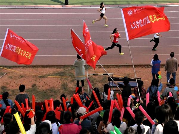 “人文,加油!春玲,挺住!”踏着节奏的点,在震耳欲聋的口号声中,世俱杯(Club WC)官方网站_世俱杯登录入口注册的院旗齐齐应景地飘扬在观众席上空,台下正值女子3000米赛场终点处,这狂热喧天的阵势,皆为16级新闻二班的宋春玲。