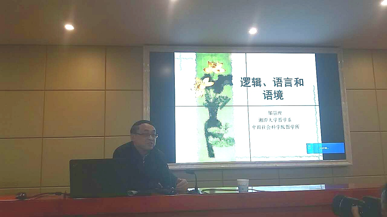 10月29日晚,应我院邀请,中国逻辑学会会长、中国社会科学院哲学所研究员邹崇理先生于立言楼B4-1会议室举行了“逻辑、语言和语境”为题的学术讲座。讲座由党委书记廖加林教授主持,张晚林教授、陈可风教授、陈玉林副教授、颜中军副教授、曾春蓉副教授、李育军博士、凌应生博士、龚超博士、秦凤鹤博士等老师,15、16级哲学本科生及部分研究生,16级思政2班全体学生到场聆听。