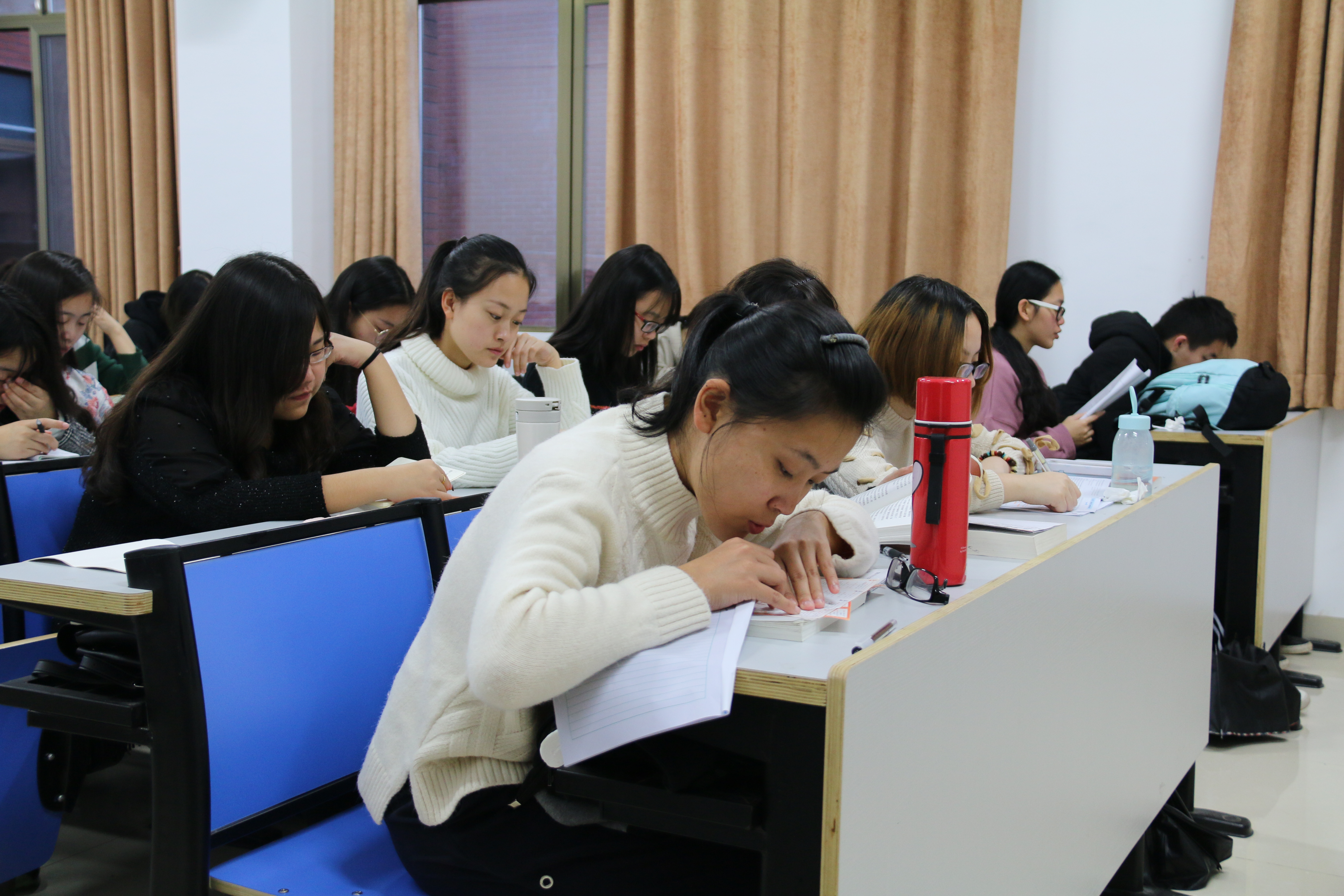 早上8时整,“上课”,伴着第一节课老师的一声令下,林雪迅速地将自己桌上的英语六级词汇换成了《中国文学作品选读》。“巴金的《激流三部曲》包括哪三部作品呢?”老师的话音刚落,林雪就举手站起来有条不紊地说出了正确答案。课堂上,林雪的思路总能紧紧跟随着老师讲课的思路,目光时而注视着老师放映的PPT,亦或是埋头在书上做着笔记。