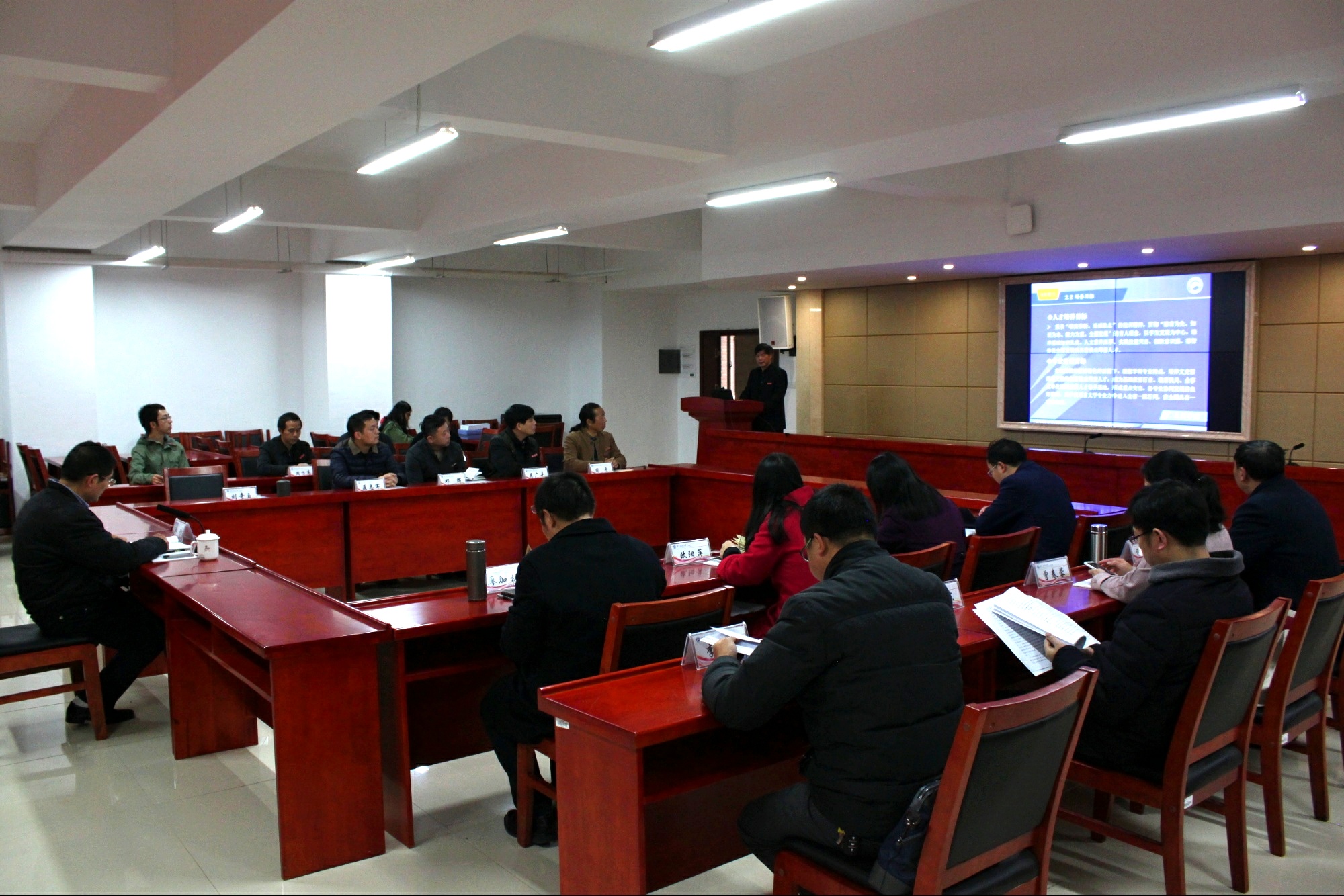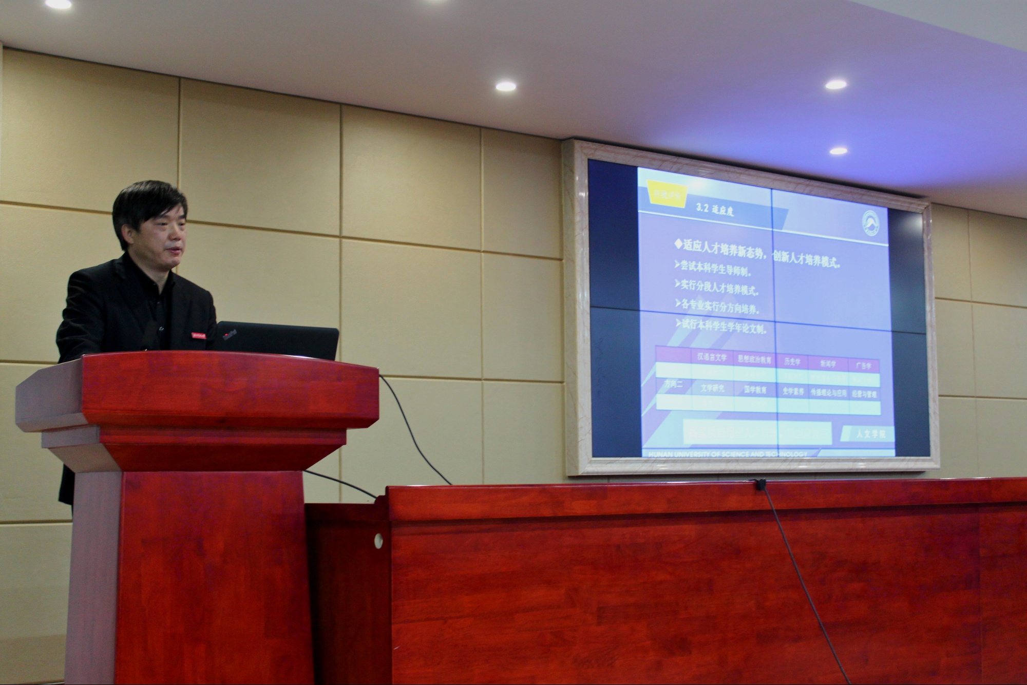 上午9时许,现场考察转移到立言楼B4-1报告厅,院长刘奇玉教授主持会议并做简要的汇报,院领导、相关系部负责人和教师代表近20人出席会议。刘院长首先简要阐述了世俱杯(Club WC)官方网站_世俱杯登录入口注册的办学历程以及办学现状,学院的师资队伍以及定位与目标,他指出我院的办学类型是教学研究型,办学层次是本科教育为主,发展目标是特色鲜明的高水平教学研究型学院。3211工程、豆沙包工作室、黑蚂蚁传媒工作室、语言艺术团、隐山哲学社等学院优秀项目是学院坚持“守正创新”办学宗旨的重要体现。