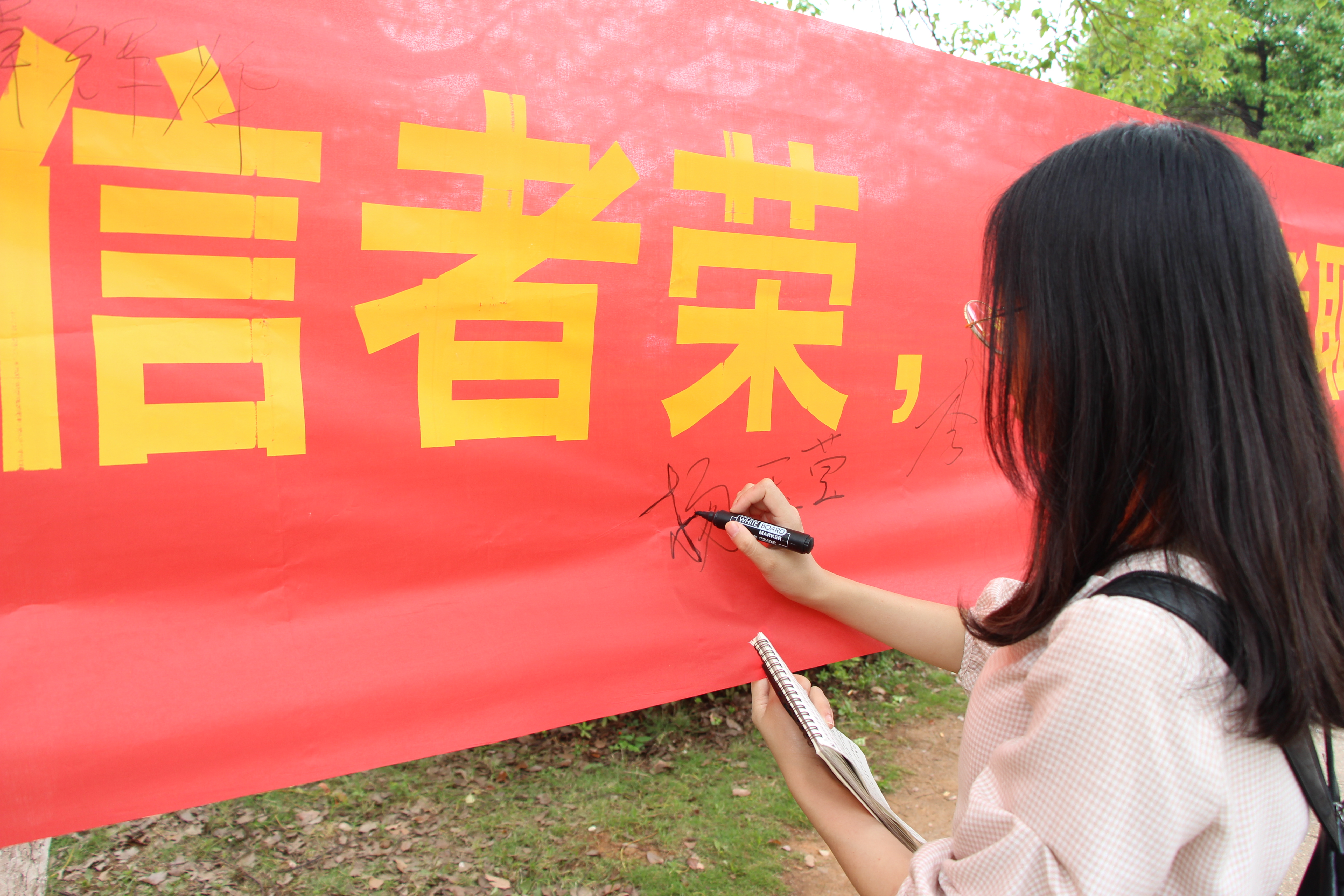 此次活动以“诚实,道德之基;守信,和谐之源”为主题,面向14级贷款学生,学院贫困生及其他大部分人员。活动寓教于乐,设置四个小游戏让同学们参与,并设有奖品,同时,向同学发放诚信读本,采访他们对诚信的认知与理解、实践状况,做好笔录,邀请他们在横幅上签字、写诚信三笔字。