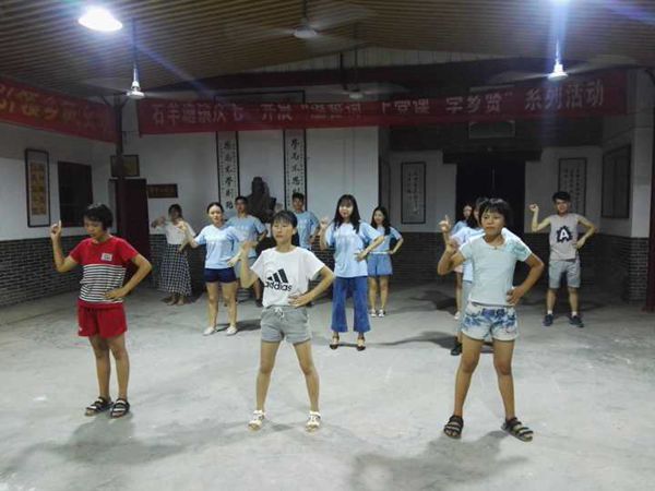 最后一天,志愿者们排演多天的文艺汇演登上了小广场的舞台。“喜欢你,那双眼动人,笑声更迷人,愿再可,轻抚你,那可爱面容,……”演出在志愿者刘俊卿动人的歌声中拉开帷幕,紧接着志愿者唐竞男带来了舞步灵动的《C哩C哩》,银文深情的诗朗诵《再别康桥》给乡亲们带来不一样的听觉盛宴,连当地的儿童也拉上了志愿者一起跳起了舞蹈《海草舞》,再次将全场气氛推向高潮。乡亲们意犹未尽,大为赞叹,此时,志愿者们面向观众围成半圈一曲《我只在乎你》道不完志愿者们对石羊塘镇父老乡亲们的感谢与情谊,“我只在乎你,心甘情愿感染你的气息”,余音淼淼,久不停歇。