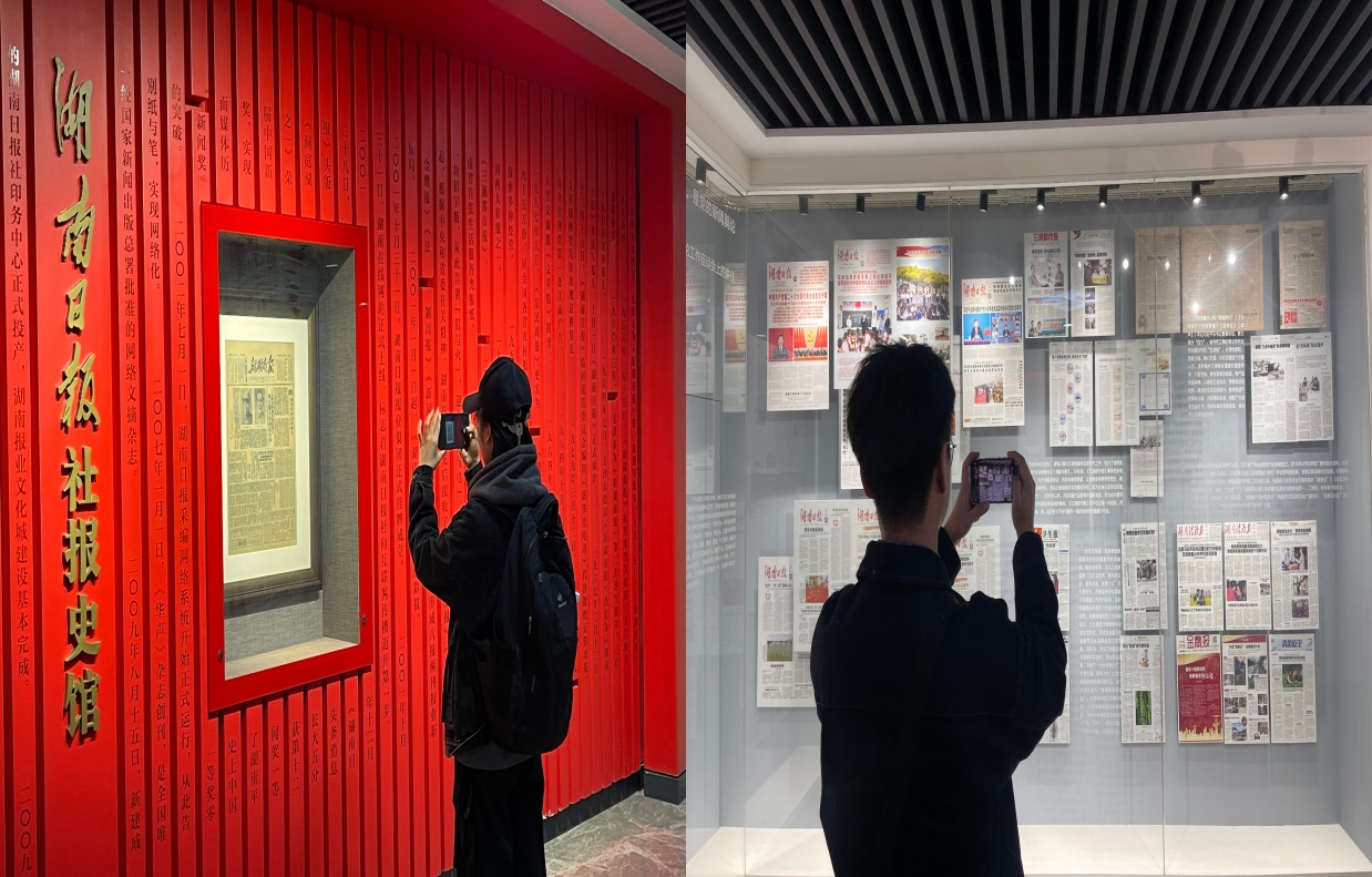 活动的第一站,学生们参观了湖南日报社史馆。在讲解员的引导下,同学们深入了解了湖南日报社的历史发展脉络,特别是其在党媒发展中的重要地位和作用。通过详细的展示和讲解,学生们进一步认识到,湖南日报不仅是地方性新闻媒体,更肩负着宣传党的方针政策、传递主流价值观的重要使命。这一环节使同学们对党媒的历史责任与社会作用有了更为全面的认知,也激发了他们对新闻事业的热爱与敬畏。